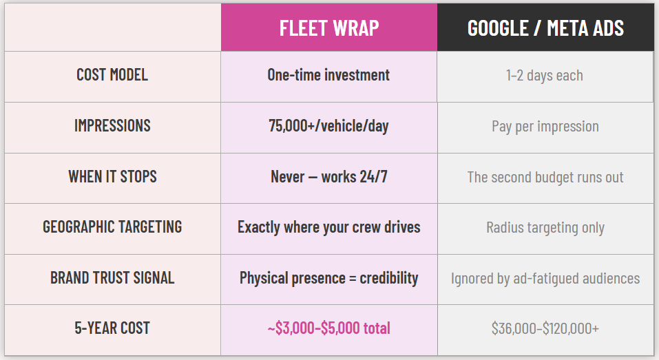 Home service companies spend an average of $120 per lead on Google Ads — money that evaporates the moment the budget runs out. A Wicked Wraps fleet wrap is a one-time investment in advertising that never goes dark.